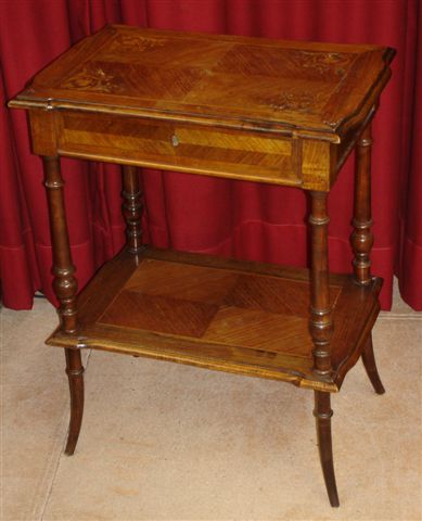 TABLE D'APPOINT faisant COIFFEUSE de forme rectangulaire en bois de placage et marqueterie. Le plateau, marqueté de rinceaux, bascule et découvre un casier à compartiments avec un miroir. Pieds balustres réunis par une tablette d'entretoise.