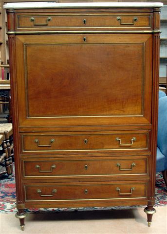 SECRÉTAIRE vertical de forme rectangulaire en bois de placage. Il ouvre à quatre tiroirs sur quatre rangs et un abattant découvrant sept tiroirs, un casier et un espace de rangement. Pans arrondis de colonnes engagées cannelées. Pieds toupie. Ornement de bronze tel que : entrées de serrures, poignées, filets d'encadrement. Dessus de marbre blanc.