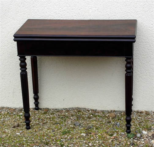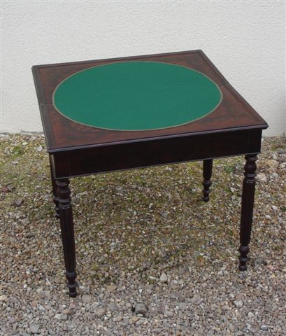 TABLE À JEU de forme rectangulaire en acajou et placage d'acajou flammé. Pieds fuselés, cannelés terminés par des bulbes.