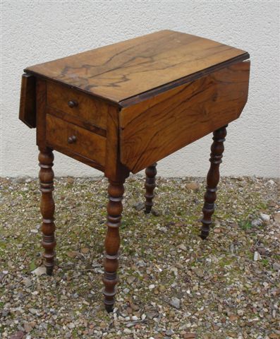 TABLE DE CHEVET en noyer et placage de noyer. Elle ouvre à deux tiroirs et un vantail. Plateau à 2 battants. Elle repose sur des pieds tournés balustres terminés par des roulettes.