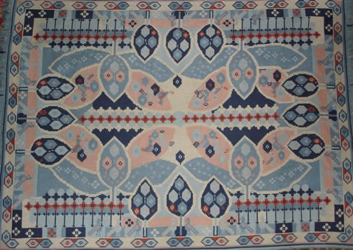 TAPIS moderne. Motifs végétaux concentriques bleus et roses peuplés d'oiseaux sur fond blanc. Bordure ornée de motifs géométriques sur fond blanc.