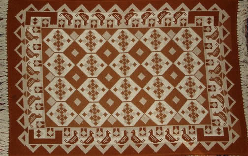 TAPIS moderne. Motif géométrique orthogonal beige sur fond marron, bordure ornée d'une frise d'oiseaux stylisés.
