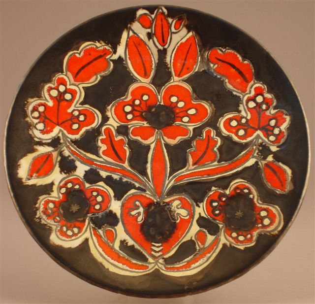 ASSIETTE en céramique. Dans le bassin, un décor floral stylisé orangé sur fond noir. Signé au revers. Joint, un calque préparatoire.