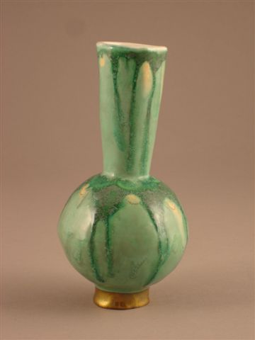 VASE à long col en céramique. Couverte verte appliquée en longues retombées. Pied doré. Signé au revers. Haut. 18 cm.