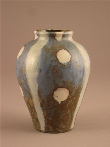 VASE pansu en céramique. Décor compartimenté de poix blancs sur fond bleu et brun. Haut. 16 cm.