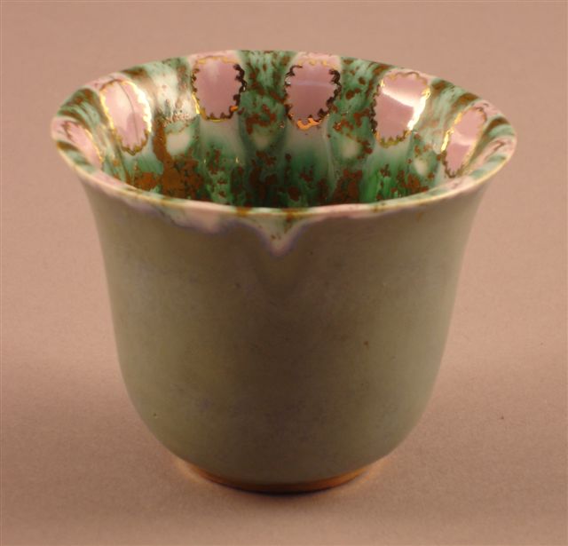 GOBELET en céramique. Couverte verte. L'intérieur est orné d'une frise de médaillons.