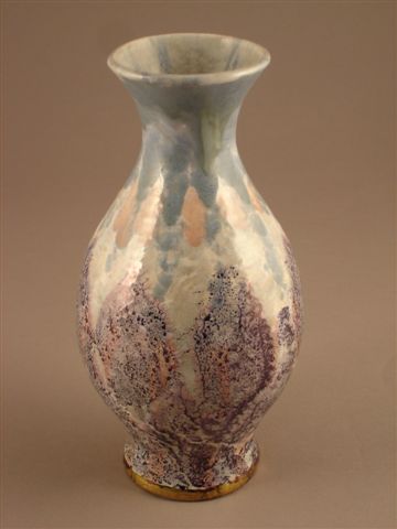 VASE pansu en céramique. Couverte polychrome, bleue, blanche et rosée.