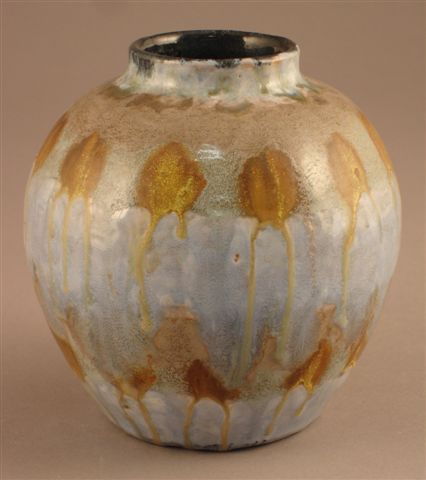 VASE pansu en céramique. Couverte polychrome en strates bleues ponctuées d'éléments bruns.