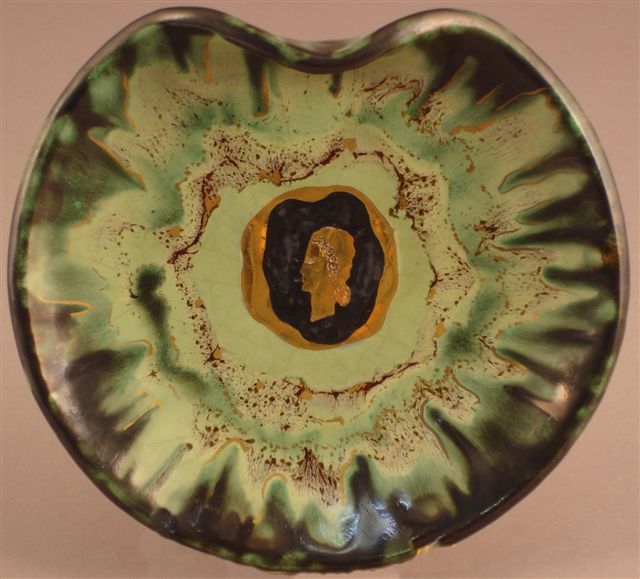 ASSIETTE en céramique. Couverte verte et noire rayonnante, centrée dans le bassin d'un médaillon contenant un profil à l'antique doré sur fond noir. L'aile est rabattue dans sa partie supérieure.