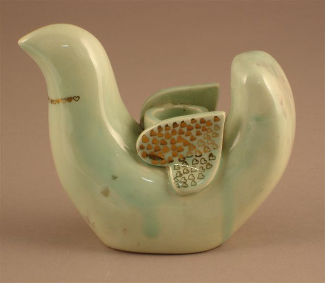 BOUGEOIR COLOMBE en céramique à couverte céladon. Les ailes, en coeur, sont ornées de coeurs dorés.