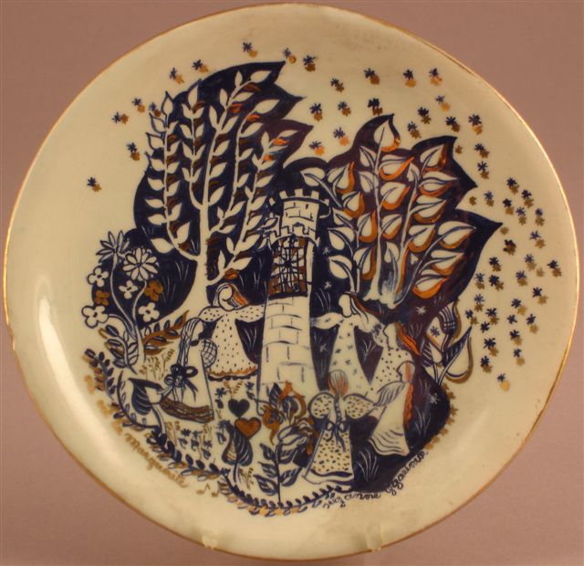 ASSIETTE en céramique. Décor bleu sur fond blanc rehaussé d'or dans le bassin d'une scène figurant quatre personnages féminins entourant une tour crénelée bordée d'arbres stylisés. Signée dans le bassin. Porte au revers une étiquette manuscrite indiquant le titre, resté illisible.