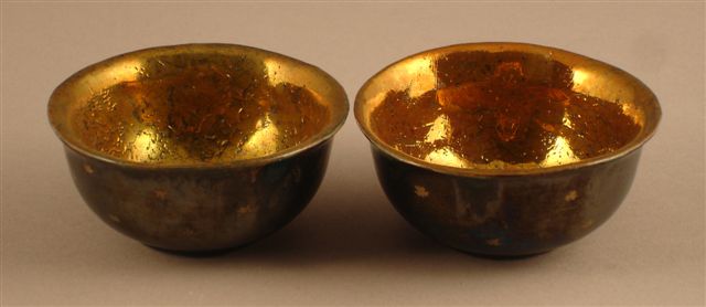 PAIRE DE COUPES en céramique. L'intérieur doré, l'extérieur noir rehaussé d'étoiles dorées. Signées au revers.