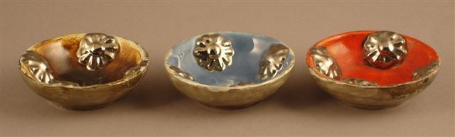 Ensemble de trois COUPES en céramique. Les trois fonds aux couleurs, écaille, rouge et bleu sont ornés en relief d'un motif de fleurettes argentées.