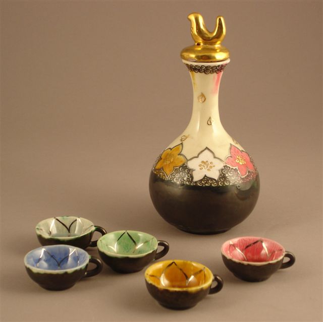SERVICE Á LIQUEUR en céramique. Il comprend une carafe ornée d'une frise de fleurs polychromes, sommée d'un oiseau doré en ronde bosse et cinq tasses reprenant, dans les bassins, une à une les couleurs de la carafe.