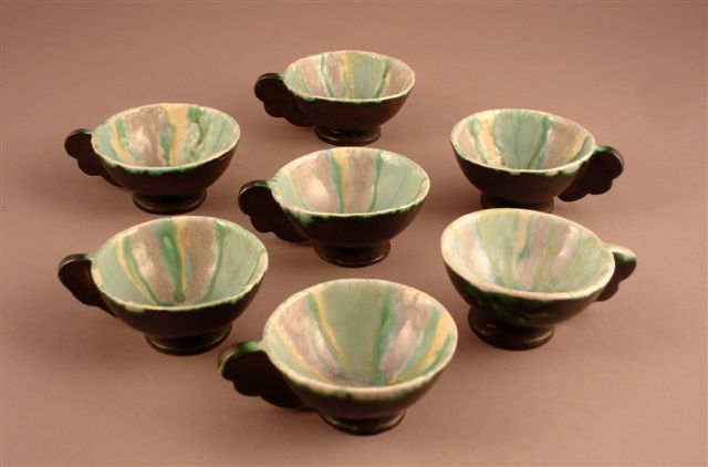 Ensemble de sept TASSES en céramique. Couverte noire à l'extérieur, verte à décor rayonnant à l'intérieur. Prises pleines.