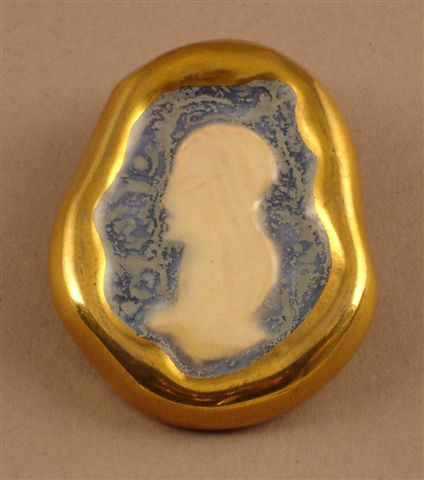 MÉDAILLON en céramique, de forme irrégulière. Centré d'un profil féminin blanc sur fond bleu dans un entourage doré. Signé au revers.
