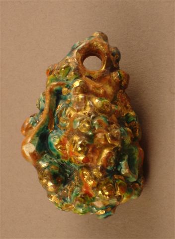 PENDENTIF en céramique. En forme de pendeloque, ornée de personnages et d'éléments polychromes en relief.