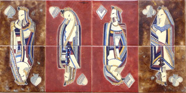 TABLE. Plateau d'une mosaïque de huit carreaux de céramique représentant quatre cartes à jouer. Signée en centre.