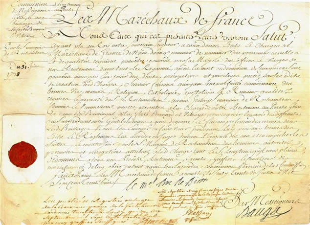 Commission de lieutenant des Maréchaux de France, au Perche-Goüet et aux bailliages de la Ferté-Bernard et de Vibraye, délivrée à Joseph-Charles II de Vimeur, marquis de Rochambeau.