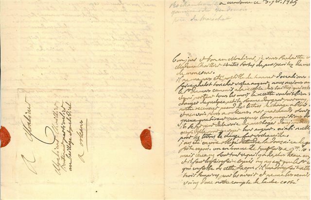 Joseph-Charles II de Vimeur, marquis de ROCHAMBEAU ( ?- 1779) grand bailli d'épée du Vendômois, père du maréchal. L.A.S., Vendôme 3 janvier 1765, à Monsieur Lhuillier, lieutenant-particulier au bailliage et présidial à Orléans ; 3 pages in-4, adresse, cachet cire rouge aux armes (brisé).