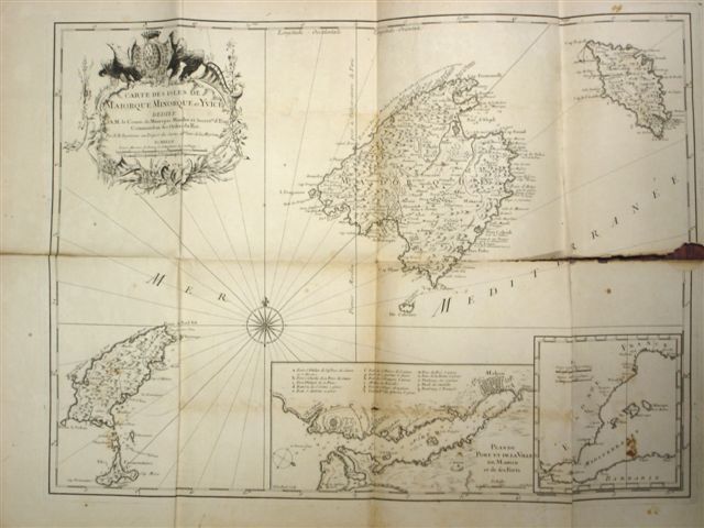 JOINT : Carte des isles de Majorque, Minorque et Yvice dédiée à M. le comte de Maurepas, ministre et secrétaire d'État, commandeur des Ordres du Roi. Par N.B. ingénieur au dépost des cartes et plans de la Marine. 1740. Gravée par Dheulland. 66 x 50 cm. En l'état.