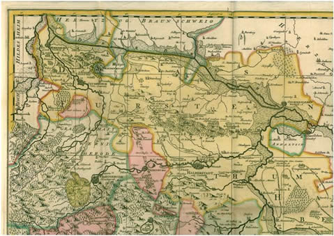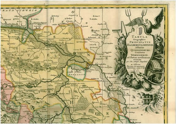 [Évêché d'Halberstadt] Tabula Geographica principatus Halberstadiensis abbatiae Quedlinburg, comitatus Wernigerod, ad statum novisimum revocata. Per Ch. Adolph Dingelsted. XVIIIe siècle. 64 x 56 cm.