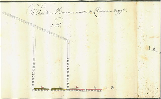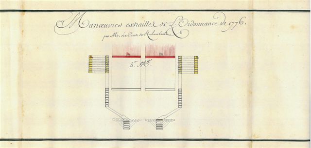 2 croquis à la plume et aquarelle sur bande de papier, annotation manuscrite au dos par le maréchal de Rochambeau, représentant les différents mouvements extraits de l'ordonnance de 1776, employés par les troupes commandées par le comte de Rochambeau, lors des manuvres militaires au camp de Vaussieux en Normandie, en 1778. 216 x 20 cm et 124 x 26 cm.