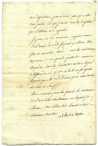 Je joins ici les nouveaux rapports venus de l'armée du sud. Il paraît qu'elle va être faite de nouvelles levées. Mais les subsistances sont rares, et une grande partie des armes a été perdue dans la déroute des milices le jour de l'affaire du 16. Le baron de Kalb est fort regretté. Il paraît que M. de la Rouerie qu'on avait dit tué, est sain et sauf.