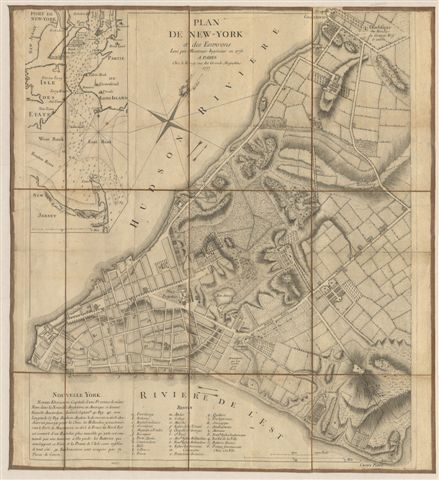 Plan de New-York et des environs, levé par Montrésor ingénieur en 1775. Paris, Sr. Le Rouge, 1777. Calque en 12 sections montées sur toile et pliées, formant une carte de 55 x 61 cm.