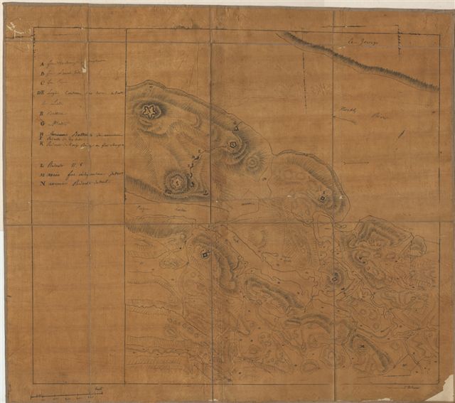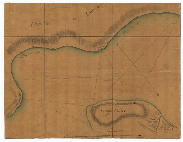 Ouvrages et redoutes - Morisania, une partie de l'île de New-York, de Long-Island, de l'île de Montrésor et de celle de Buchanan. Calque en 3 sections montées sur toile et pliées, formant une carte de 33,5 x 24 cm. Plan manuscrit figurant les redoutes, blockhouses et batteries.