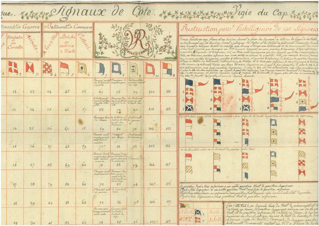 2 tableaux des signaux de côte de la vigie du Cap, avec instruction pour l'intelligence de ces signaux, plume et aquarelle, 2 pages grand in-fol.