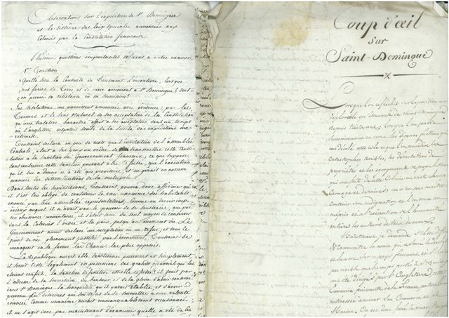 JOINT : 6 exemplaires de la Gazette officielle de Saint-Domingue et un exemplaire des Affiches américaines de Saint-Domingue, 1803, imprimés - Mémoire manuscrit anonyme intitulé Coup d'il sur Saint-Domingue, 8 pages in-fol. - Mémoire manuscrit anonyme intitulé Observations sur l'expédition de Saint-Domingue et le système des lois spéciales annoncées aux colonies par la Constitution française, 9 pages in-fol. - 4 pièces diverses manuscrites en anglais dont une datée du 25 juillet 1807 avec un superbe cachet de cire rouge - 2 pièces autographes du maréchal de ROCHAMBEAU relatives à Saint-Domingue - Copie des dispositions ordonnées par le général Leclerc, au Cap 28 pluviôse X, avec vignette Armée expéditionnaire - Esquisse de la conduite de l'ex-préfet Magnytot de Saint Domingue, 8 pages in-fol. manuscrites - L.A.S. par RAFFIN, directeur de l'octroi, 26 octobre 1801, qui fait un état des lieux des hommes qui composent l'armée rebelle - L.A.S. par Jean-Baptiste de VAUBLANC (1761-1812), Paris 27 mars 1803 - 8 pièces manuscrites diverses (pétition, lettres) relatives à Saint-Domingue, 1802-1810.
