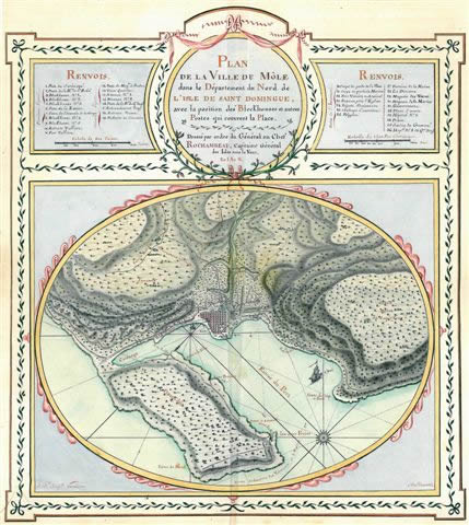 Plan de la ville du Môle dans le département du Nord de l'Isle de St Domingue avec la position des blockhouses et autres postes qui couvrent la place, dressée par ordre du général en chef Rochambeau, capitaine général des Isles sous le Vent, en l'An 11. Plume et aquarelle. Légendes. 28,5 x 32 cm.