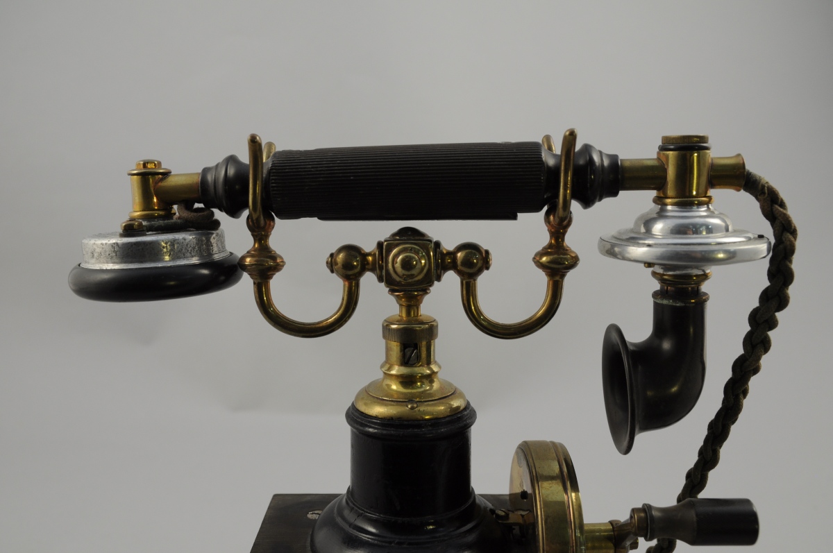 L.M. ERICSSON AND CO. Téléphone mobile dit "Machine à coudre" en métal laqué, laiton et bois peint. Piètement en métal laqué noir à décor de ferronneries vert et or. Combiné, manivelle et deux timbres de sonnerie incorporés. Modèle 1894. Marqué "L.M. ERICSSON & Co" de chaque côté du piètement. (petits manques)