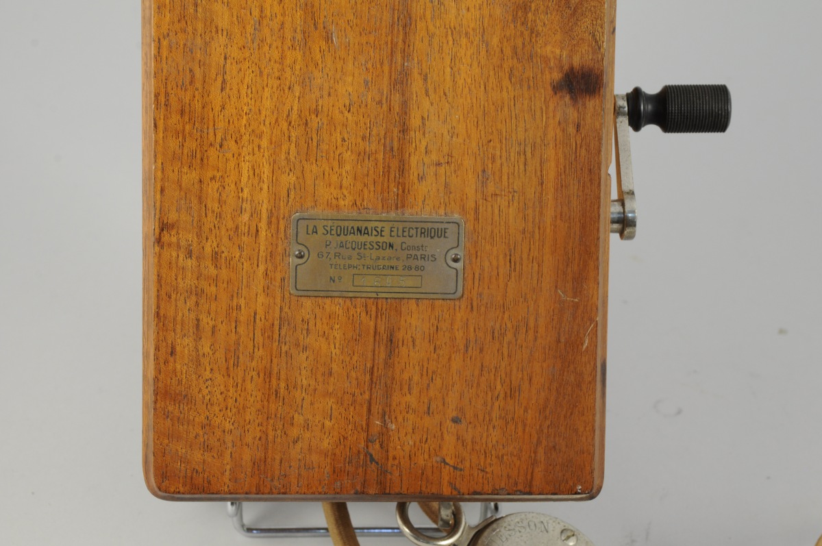 LA SÉQUANAISE ÉLECTRIQUE. Téléphone mural à caisson rectangulaire en noyer. Combiné et écouteur en métal chromé et ébonite Jacquesson. Porte une plaque en laiton marquée " La Séquanaise Électrique / P. Jacquesson, constr. 67, / 67, rue St Lazare, PARIS / Téléph : Trudaine 28-80 / N° 1605". Circa 1910. (légères usures)