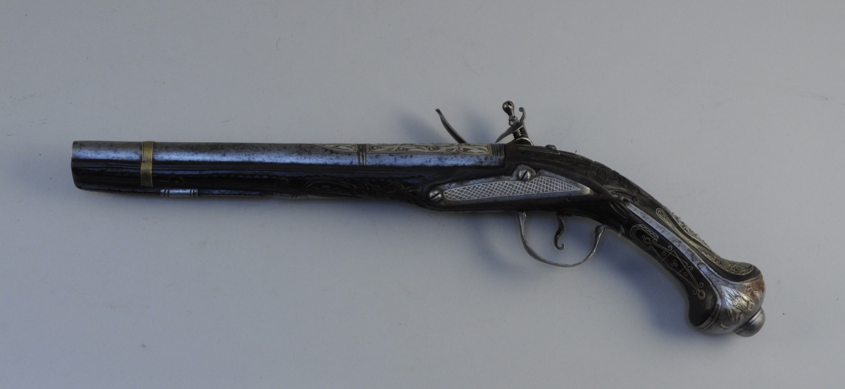 Paire de PISTOLETS à silex. Canons ronds, à méplats aux tonnerres, damasquinés d'argent. Platines et chiens col de cygne à corps plats, damasquinés en suite. Bassinets à jours en fer. Garnitures en fer découpé, décoré en suite. Crosses en bois noirci et fûts entièrement sculptés, incrustés de fils d'argent à l'arrière et d'une pièce de pouce en étain. Baguettes en bois simulées.