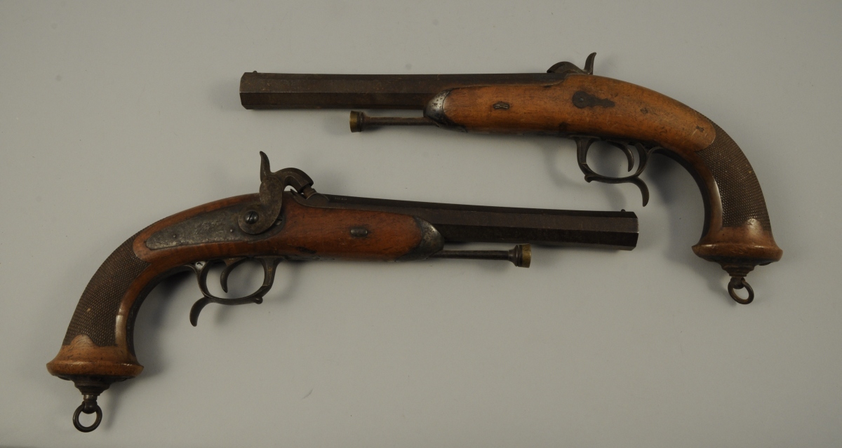 Paire de PISTOLETS D'OFFICIER à percussion, modèle réglementaire 1833, 2ème type (?), à canons octogonaux rayés et damassés. Crosses en noyer guilloché. Les platines marquées "Mre Impale de Châtellerault". Les canons marqués 1855, MI, et poiçonnés F et C. Longueur : 37 cm, Canon 22,5 cm.