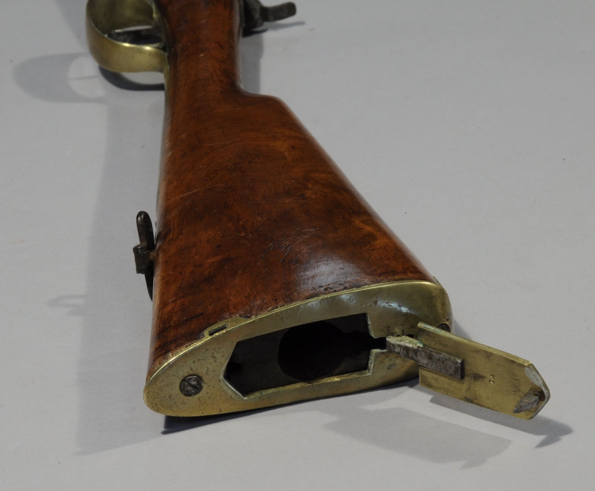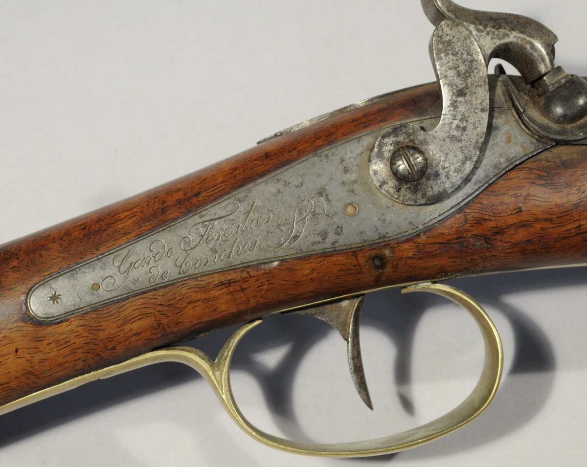 FUSIL DE CHASSE à percussion, un coup, de garde forestier. Platine arrière gravée "Garde forestier de Conches". Garnitures en laiton.