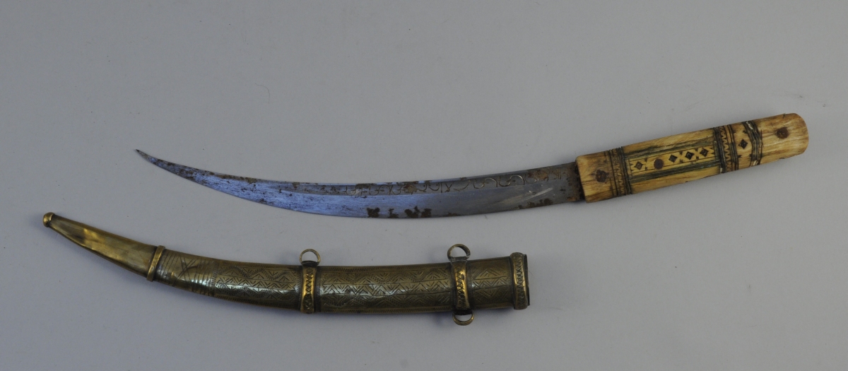 POIGNARD d'Afrique du Nord. Poignée en bois incrustée de laiton et décorée au feu. Lame courbe à dos plat et gouttière, gravée. Fourreau en laiton à deux anneaux de suspente et quatre bracelets ciselés sur le devant.
