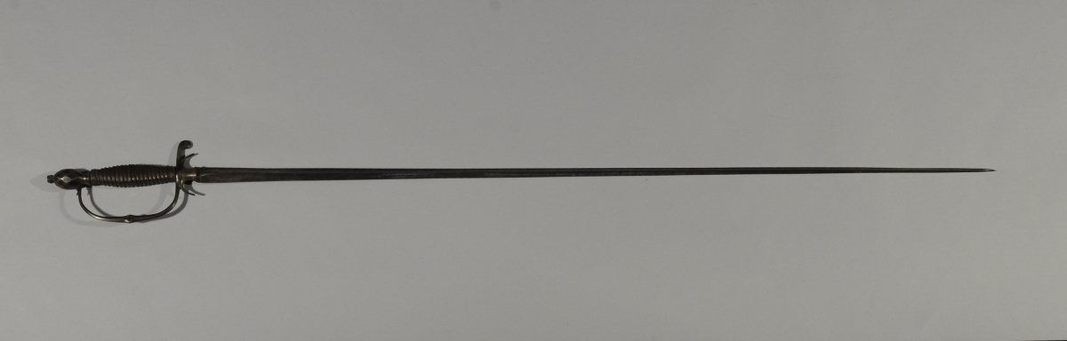 ÉPÉE DE COUR. Monture en fer à pommeau piriforme facetté. Garde à une branche, pas d'âne et quillon recourbé (manque le plateau). Fusée en fer à cannelures horizontales. Lame triangulaire. Seconde moitié du XVIIIème.