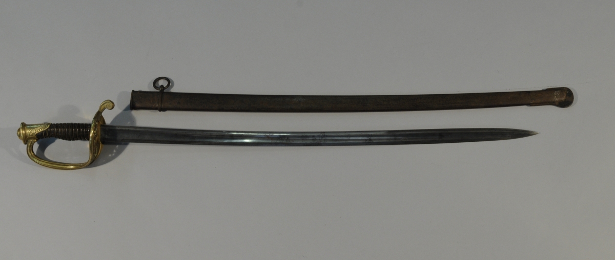 SABRE d'adjudant d'infanterie, modèle 1845. Poignée en corne (manque le filigranne) Monture en laiton ciselé. Lame courbe à dos plat gravée : "Manufacture nationale d'armes de Châtelleraut 9bre 1913 - Adjt d'Infrie Mle 1845". Fourreau à un bracelet de bélière en métal au même numéro "39128".
