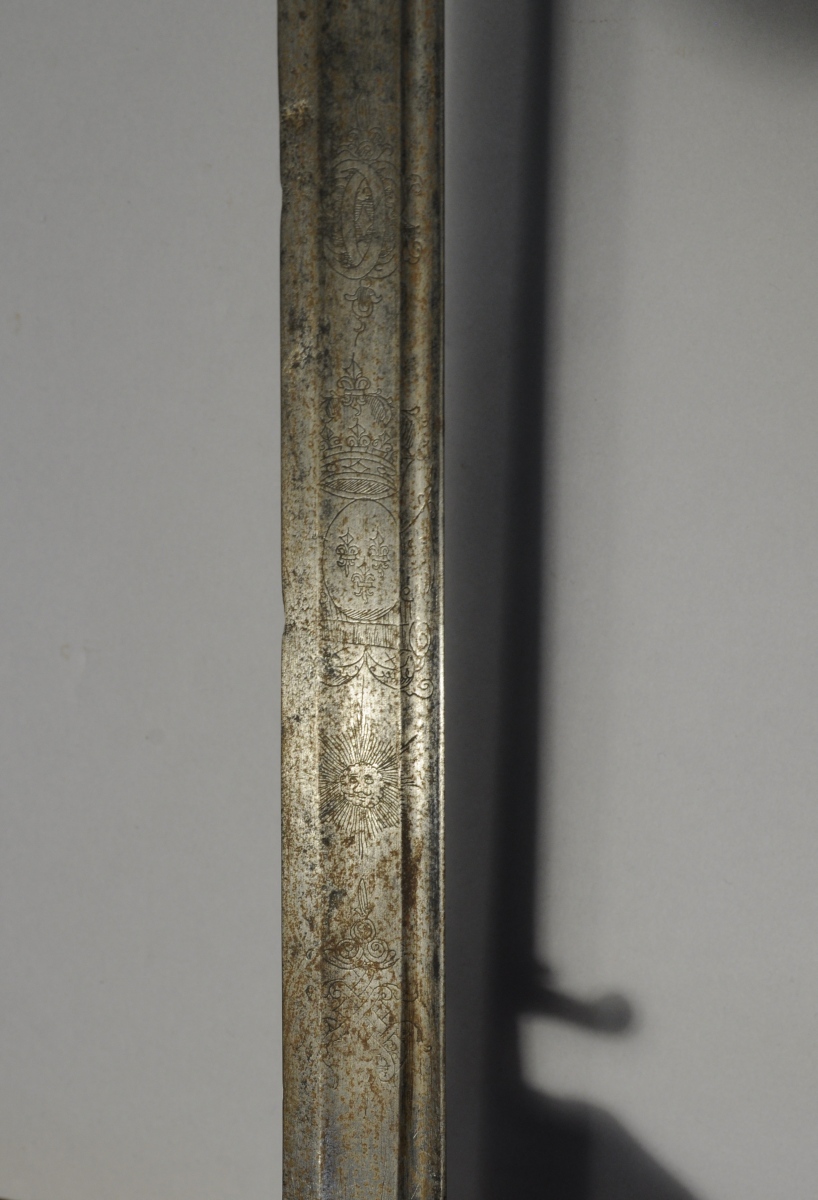 COUTEAU DE CHASSE, monture en argent. Croisière à deux quillons inversés. Poignée en crosse en ébène (fente) ornée de trois boutons d'argent. Importante lame droite à dos plat gravée d'un côté "Vive le Roy" dans un écusson fleurdelisé et de l'autre de l'écu de France couronné, d'un monogramme "CC" et d'un soleil. Poinçons aux Fermiers Généraux. Manque le fourreau.
