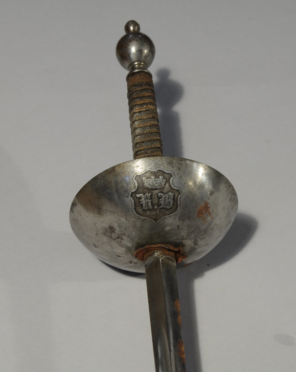 PAIRE D'ÉPÉES D'ESCRIME. Fusée en bois gaîné de cuir et filigranne. Pommeau rond à gland. Gardes à coquille en fer gravée d'un cartouche chartourné contenant le monogramme "R.B" timbré d'une couronne de baron. Lame triangulaire signée "Coulaux & Cie Klingenthal".