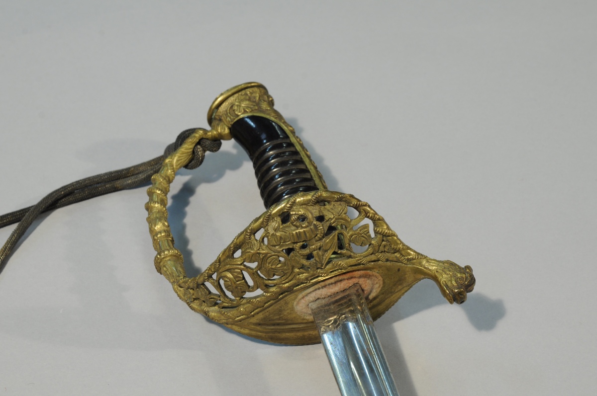 SABRE D'OFFICIER DE MARINE, modèle 1837. Poignée en corne. Monture en laiton ciselé. Lame légèrement cintrée, contre-tranchant signé "Coulaux & Cie Klingenthal". Fourreau en cuir, à deux garnitures en laiton. Chape ornée de l'ancre. Dard à coquille. Dragonne en cannetille anciennement dorée.