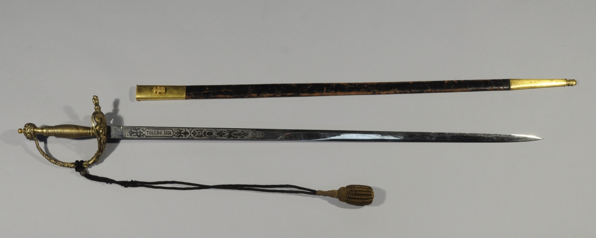 SABRE D'APPARAT. Monture en laiton ciselé et doré. Pommeau à mufle d'un animal fantastique. Garde à une branche à décor de feuilles de vigne tête d'oiseau fabuleux. Garde à motif ajouré de feuilles d'acanthe portant les armes de Castille-et-Léon timbrées de la couronne d'Espagne. Le quillon à tête d'animal. Belle lame à dos plat, ciselée au tiers, sur fond amati, de feuillages, d'entrelacs et d'un trophé figurant une épée nouée à un bâton d'armes et signée "TOLEDO 1878". Fourreau en cuir (usé) à deux garnitures en laiton doré. Le pontet fait des armes de Castille-et-Léon timbrées de la couronne d'Espagne.