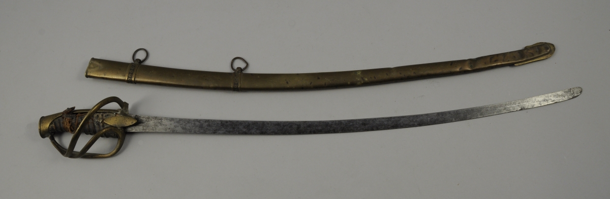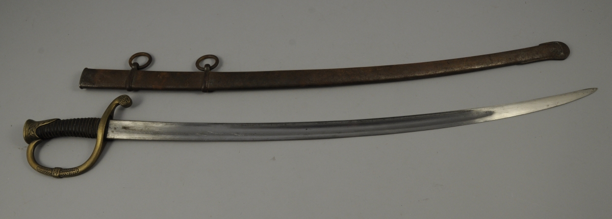 MODÈLE DE CAVALERIE LÉGÈRE. Monture en laiton à une branche. Décor de palmettes, fleurettes et branches de laurier. Poignée gaînée de basane filigranné. Lame légèrement courbe à dos plat. Fourreau en tôle de fer à deux bracelets et deux anneaux de bélière.