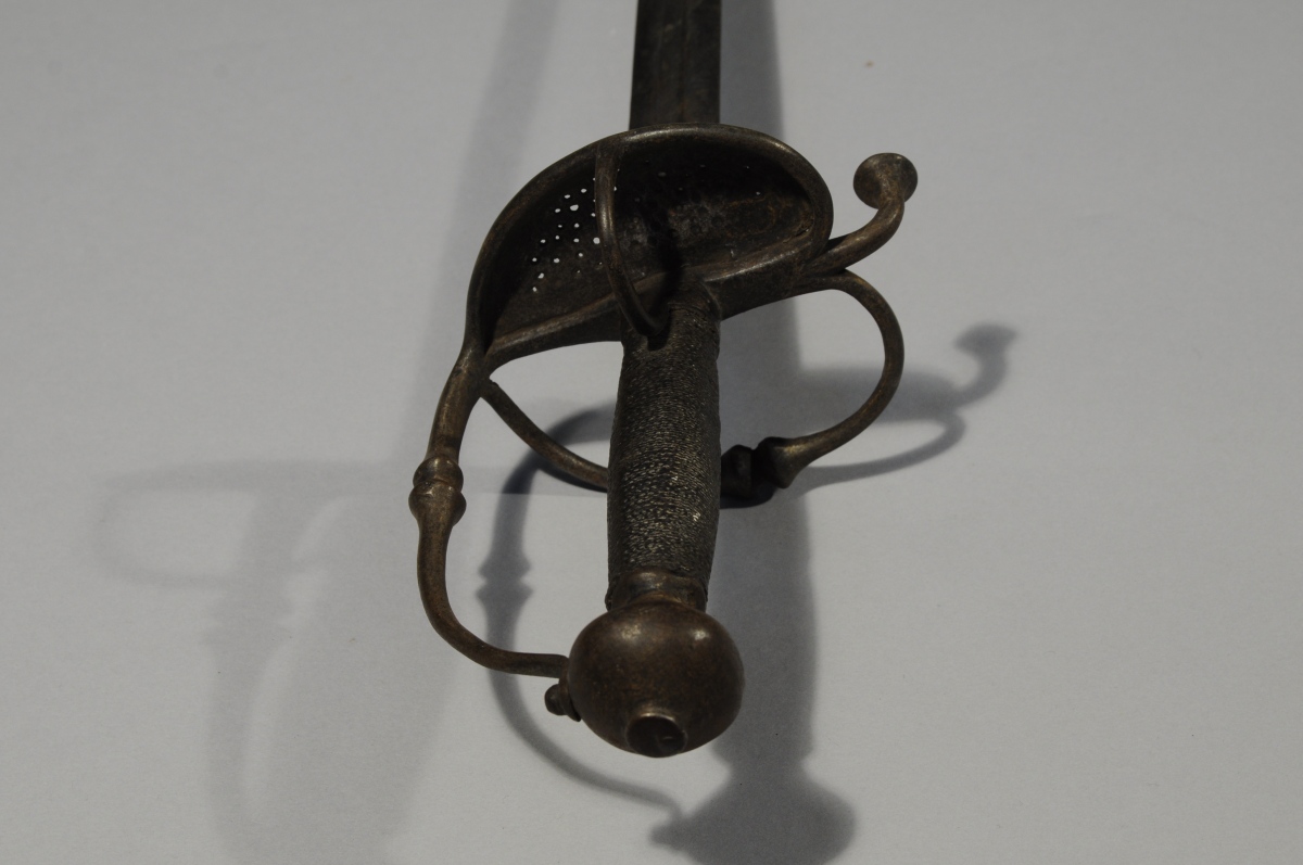 WALLONNE DE CAVALERIE. Monture fer à une branche à boules et quillon recourbé. Pontat à grille perforée et pièce de pouce. Fusée entièrement filigranée. Lame de Solingen à double tranchant et gorge centrale au talon signée IOHANNI. Sans fourreau.