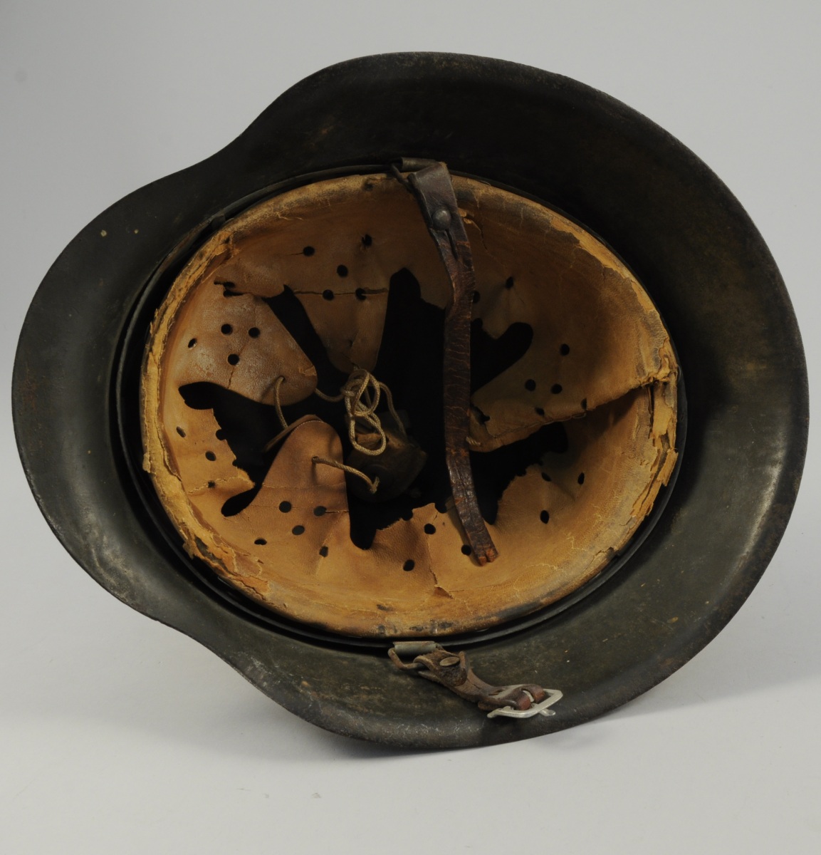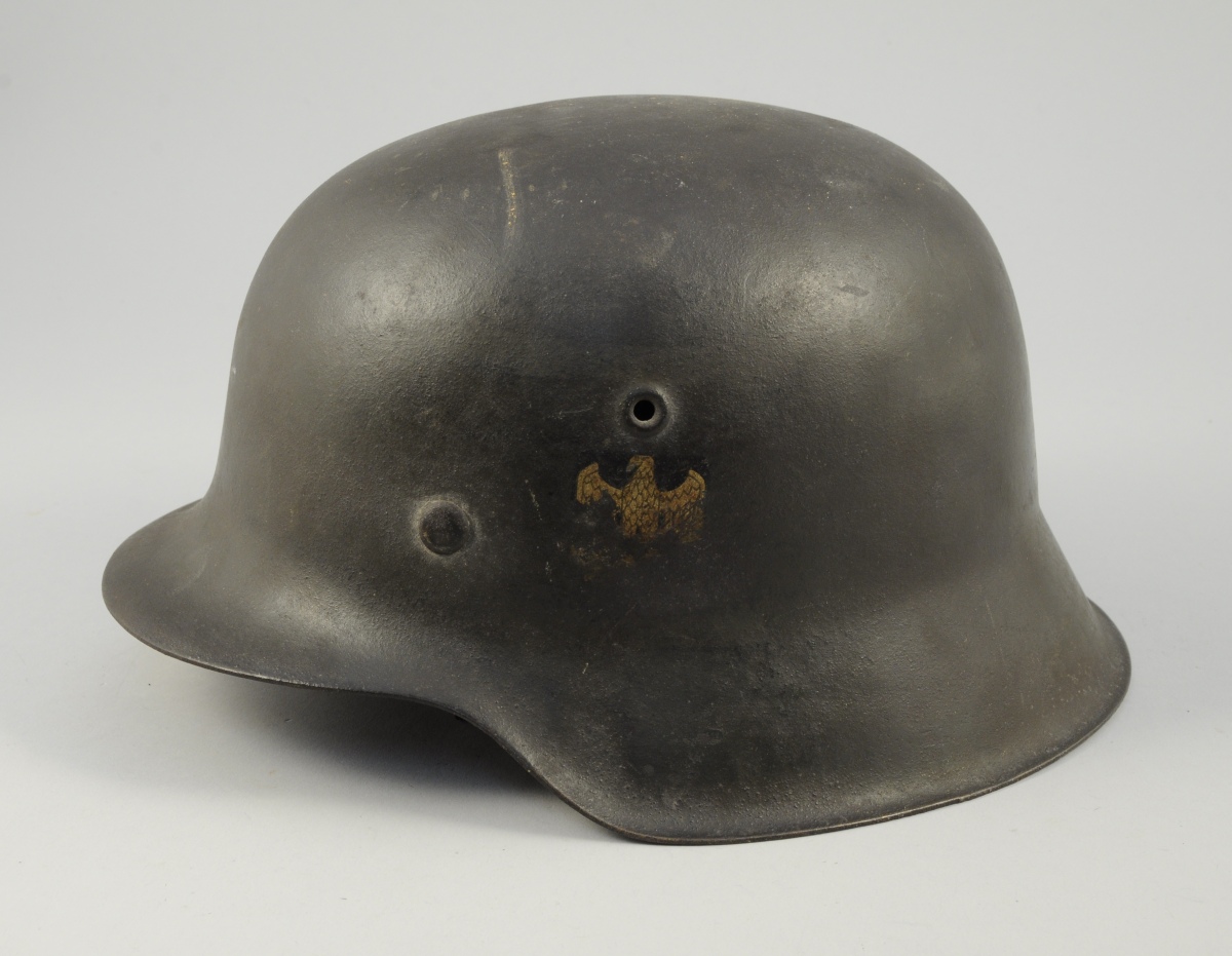 ALLEMAGNE, CASQUE modèle 1942. Peinture gris/vert mate. Insigne à l'aigle (dénazifié) sur le côté gauche. Coiffe et jugulaire (manques). Tampon de réception au fond de la coque illisible. Marqué "ck ISP / 3S5".