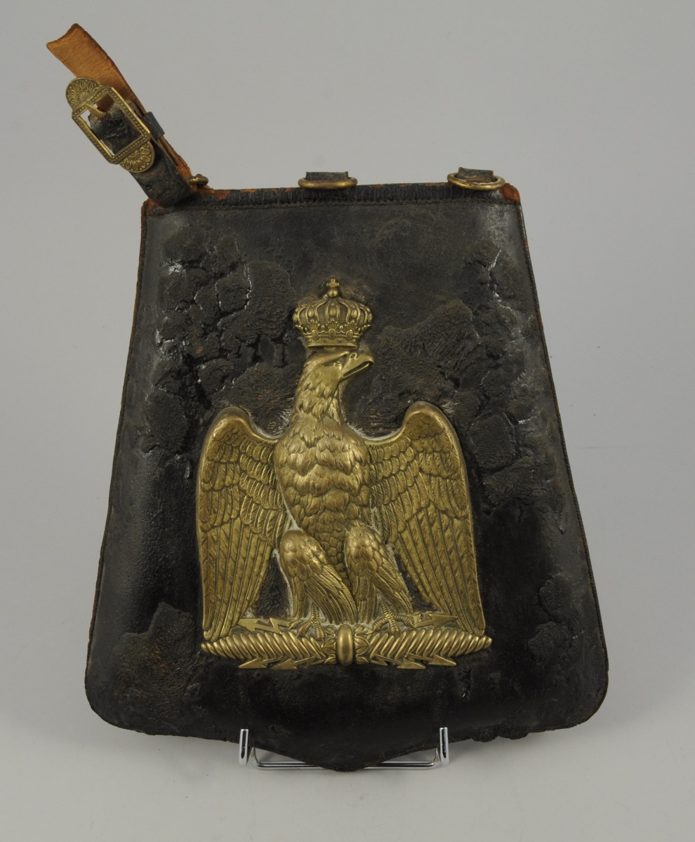 SABRETACHE de petite tenue d'officier de cavalerie légère en cuir noir verni. Plateau présentant un ornement en bronze estampé et doré figurant l'aigle impérial couronné empiétant un foudre. Intérieur en velours bleu.