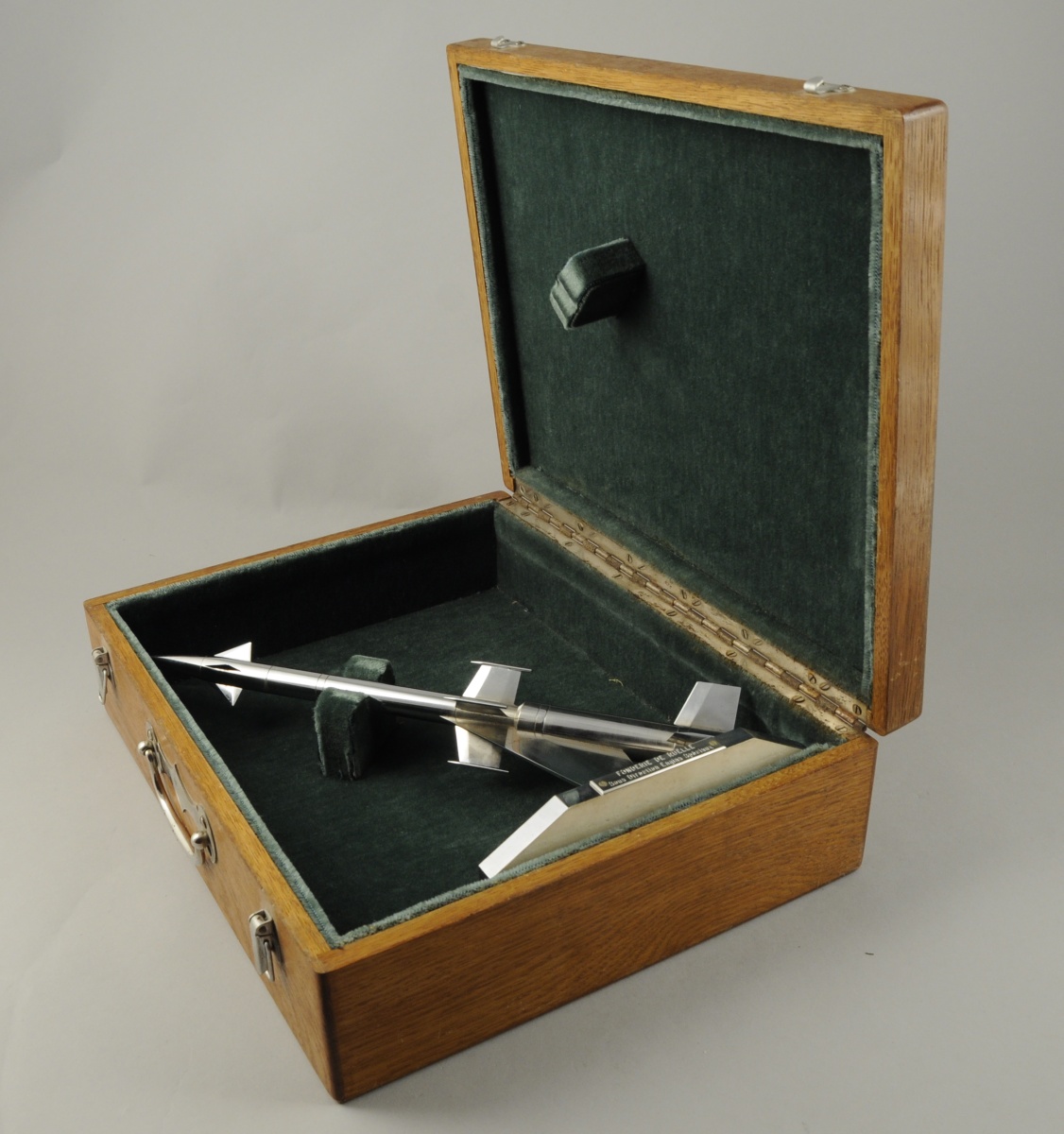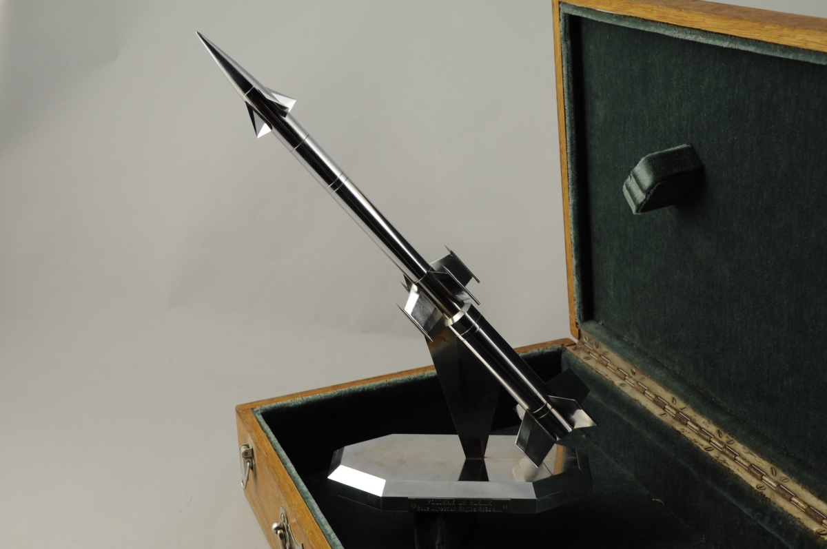 MAQUETTE de MISSILE MASURCA en acier chromé. Le socle à pans coupés porte un cartel marqué "FONDERIE DE RUELLE / Sous Direction Engins Spéciaux". Elle est conservée dans son coffret en bois gaîné de velour vert.